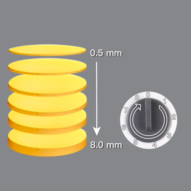 - ALSIDIG: Med 40 skivemuligheder, som kan skære perfekt fra 1-8 mm i tykkelse, og som også tilbyder muligheder for at skære, strimle og skære i tern.
