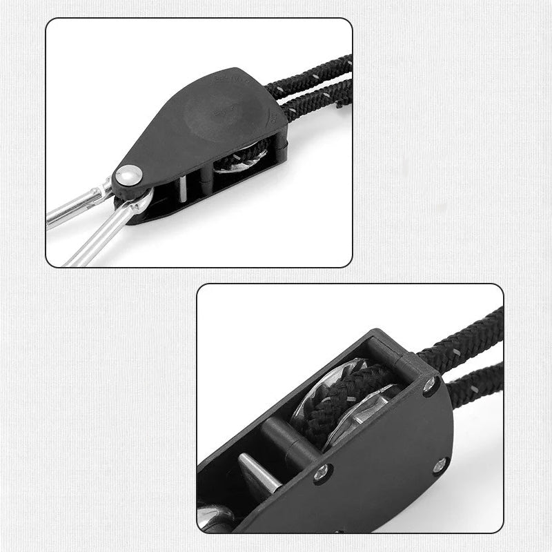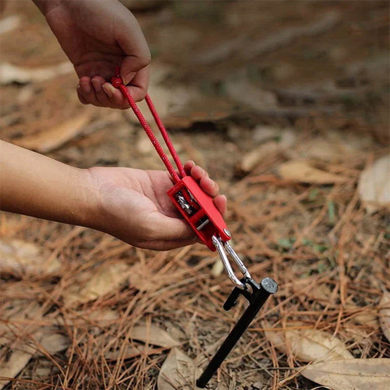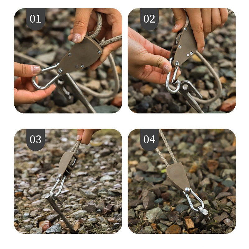 Gør campingen lettere og hurtigere: Her skal hængekøjen blot hægtes fast og teltpresenningen eller teltpælene ved karabinhagerne. Brug derefter remskiven til at justere rebets længde efter dit behov. Det reducerer opsætningstiden og eliminerer tidskrævende trækknuder;