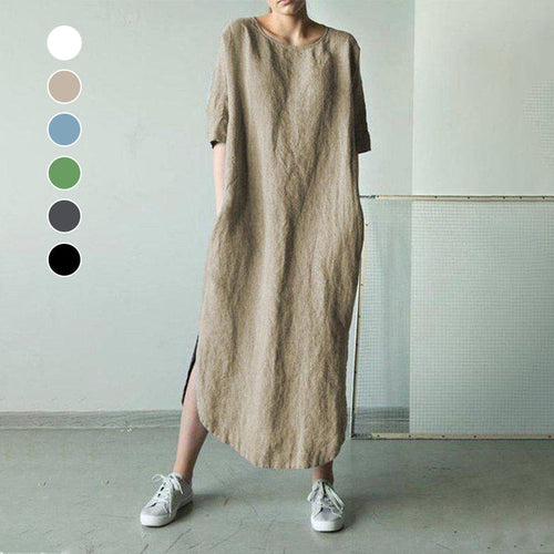 Løs kjole med rund hals og midterærme med slids