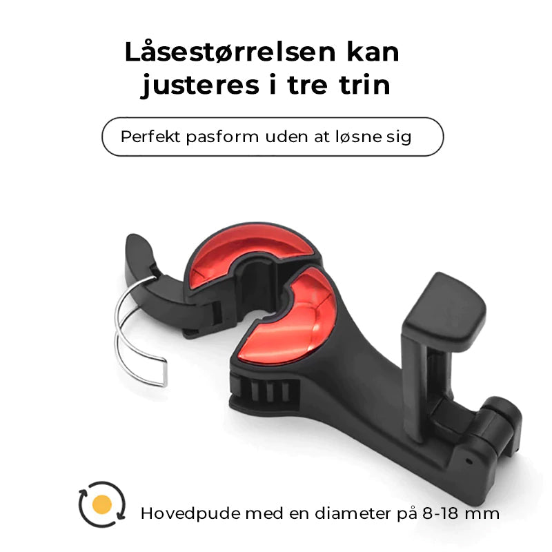 Hovedstøtteholderen giver dig et nemt sted til jakker og tasker. Den kan bruges i alle kommercielt tilgængelige køretøjer, lastbiler og busser..