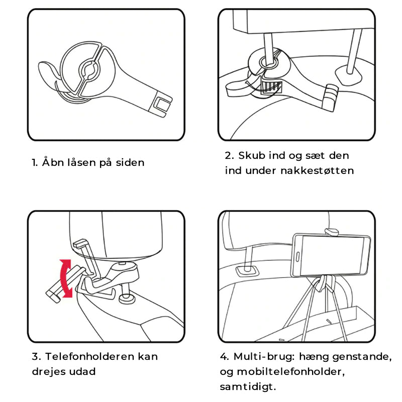 Den er fremstillet af ABS plastik og silikonegummi af høj kvalitet og beskytter nakkestøtten mod ridser og skader. Enkel montering er mulig for alle. På grund af 360-graders rotation kan beslaget nemt skjules, når det ikke er i brug.