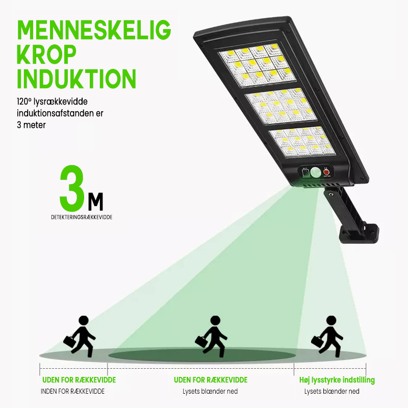 BREDERE BELYSNINGSVINKEL, NEMME AT INSTALLERE: Dette 144 LEDs solcelledrevne havelys er udstyret med den mest avancerede PIR bevægelsessensor-teknologi, der giver solid lysstyrke og bredtbelysende lys i en vinekl op til 180°. Denne solcelledrevne bevægelsessensorlampe kan monteres på væggen med medfølgende vægstik og skruer på få sekunder. Ingen kabler eller ledninger er nødvendig. Glem ikke at trykke på knappen foran. Den bedste monteringshøjde er omkring 1,8-2,2 meter. Følg venligst de medfølgende instruktioner.