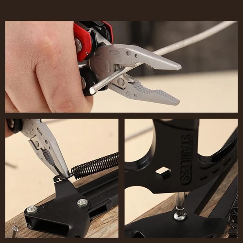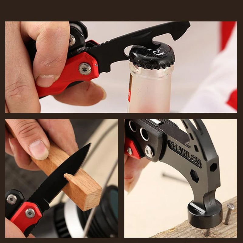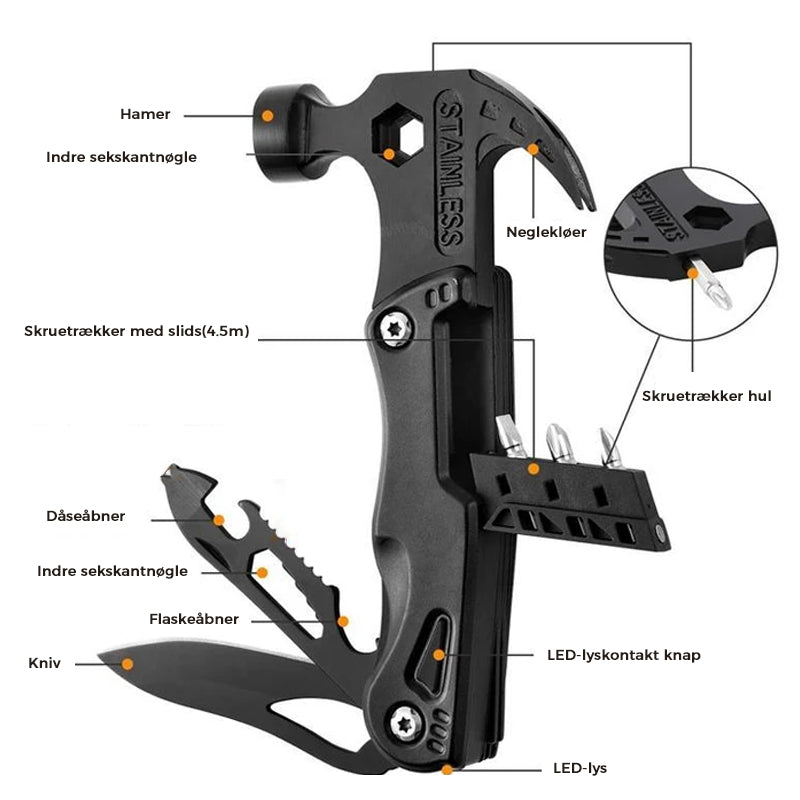 Denne tang har 7 funktioner, der giver dig mulighed for at gøre det meste. Du får en minihammer, klemme, krafttang, flaskeåbner, kniv, skruetrækkerbit, sømtrækker.