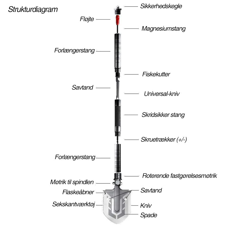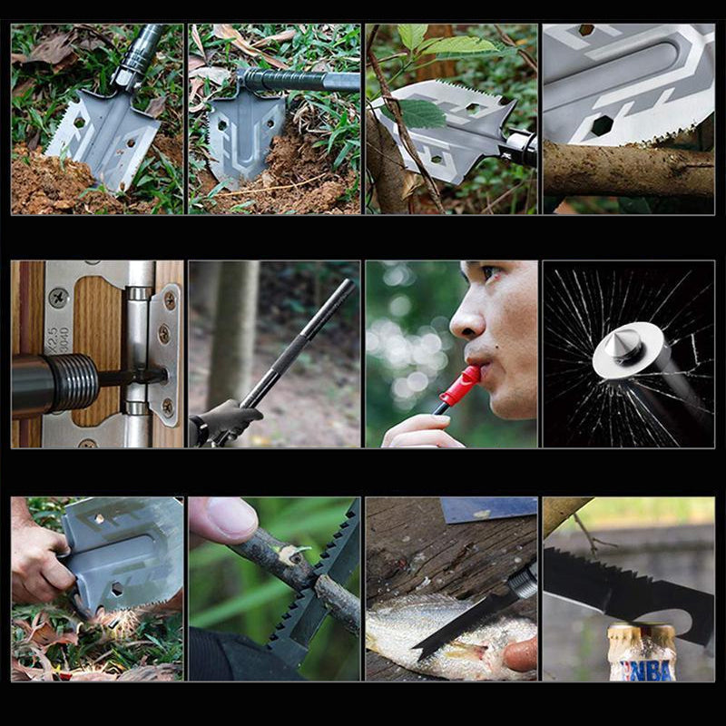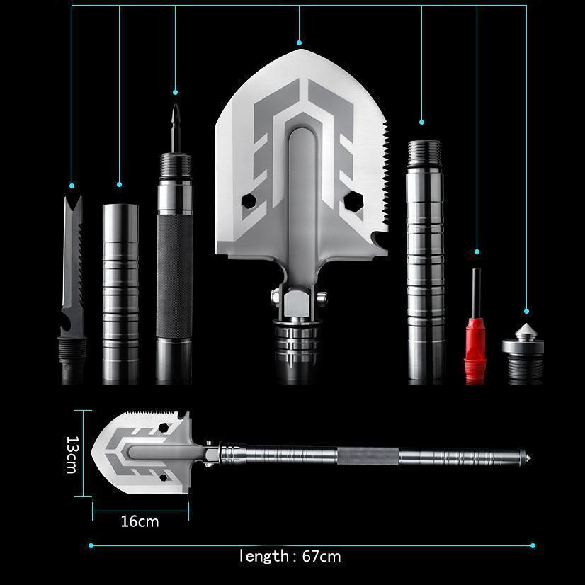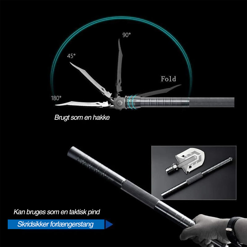 - 1 x Bærbar militær sammenklappelig skovl med taktisk taljepakke og multiværktøj