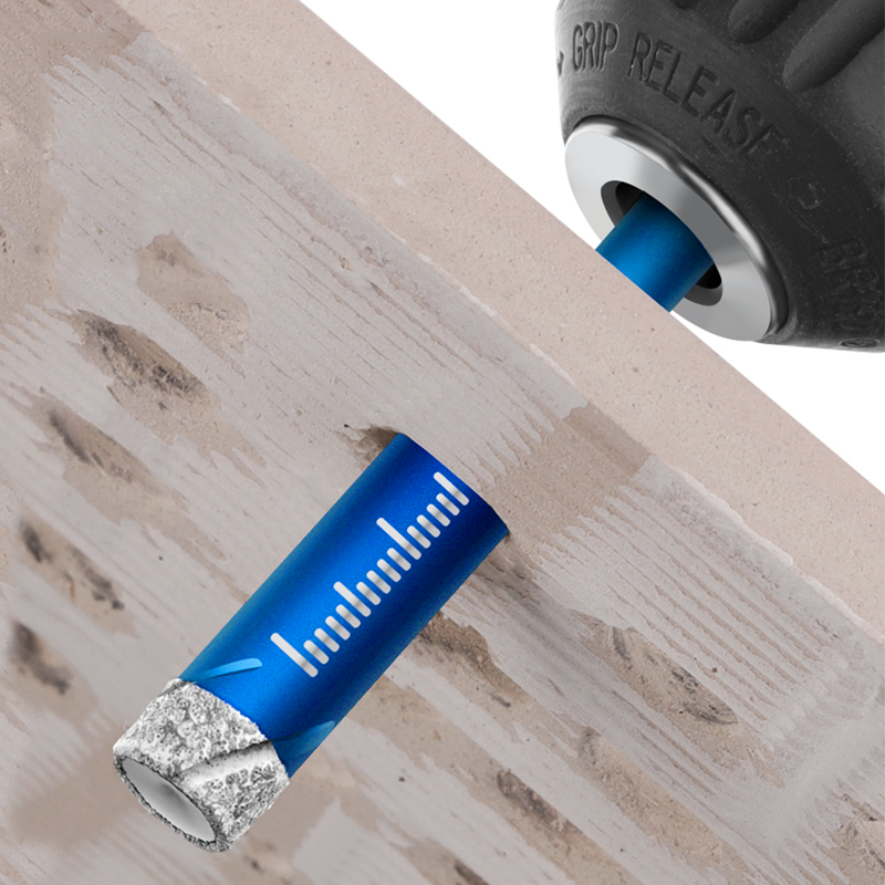 Diamant-sæt: Takket være det diamantindstillede borehoved af høj kvalitet er der garanti for et hurtigt, jævnt og rent boreresultat - selv ved følsomme materialer.