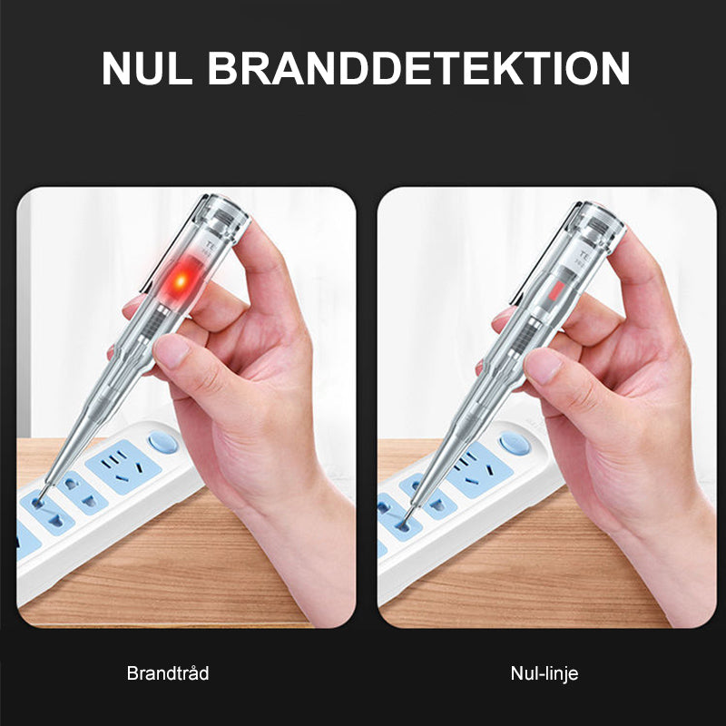 Når pennen rører ved spændingsledningens stik, lyser pennen op, hvilket indikerer, at der er strøm i ledningen. Når pennen berører jordlinjens stik, tændes lyset ikke.