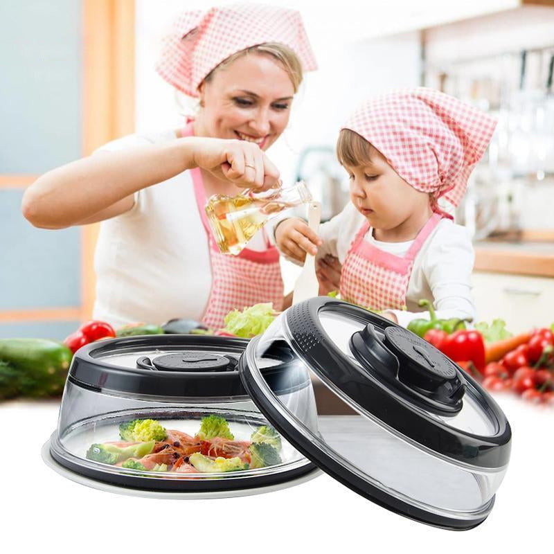 Hold dine madrester lige så gode som den dag, du lavede dem, ved at vakuumpakke dem! Det er nemt at bruge, du skal blot placere dækslet over din mad i kontakt med en ren plade med glat overflade og trykke let på toppen af dækslet for at skabe en vakuumforsegling..