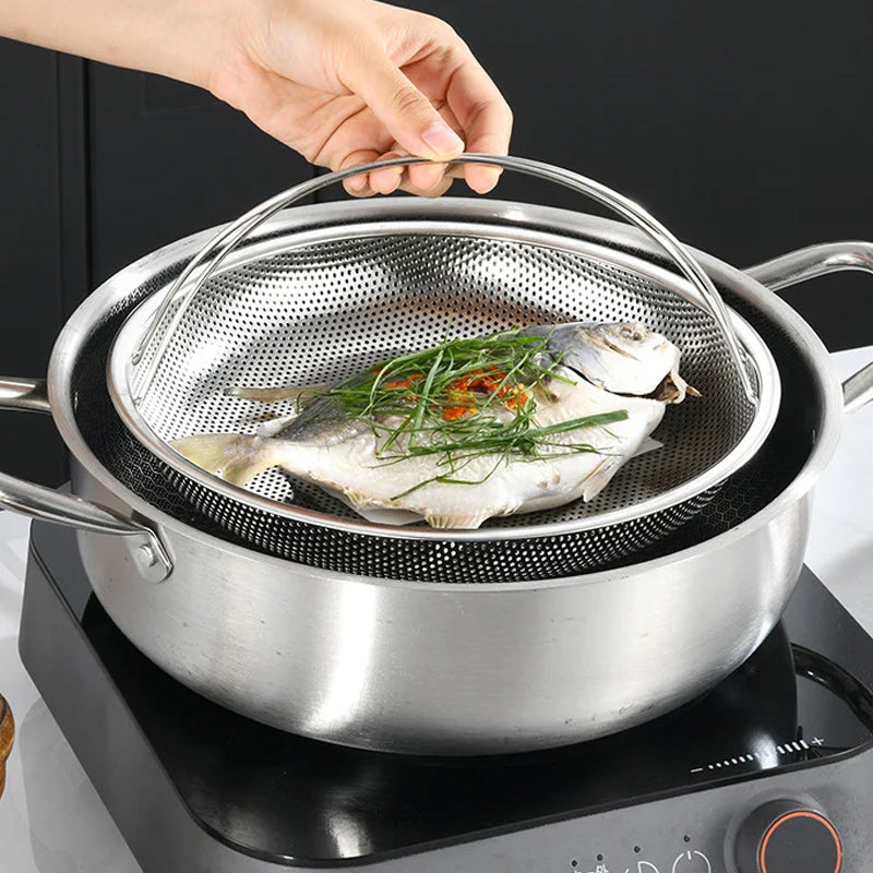 【Tykt materiale, fine filterhuller】 Jævnt fordelt, passende størrelse, ingen lækage af mad og kan opnå hurtig tilberedningseffekt.