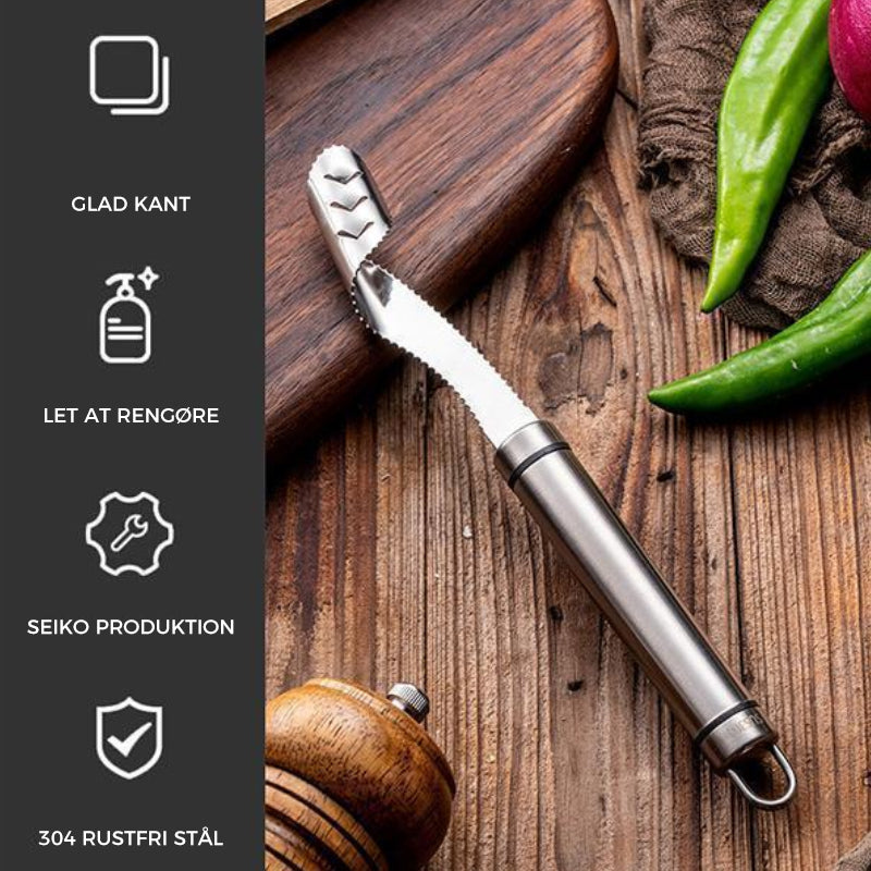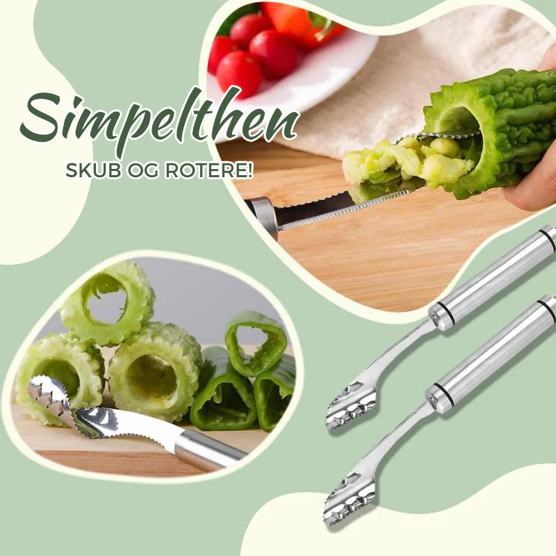 - Hurtig: Indsæt og drej rundt, så fjerner de rustfri stålblade nemt kernehuset og frøene med sine takkede kanter og skarpe indre tænder.
