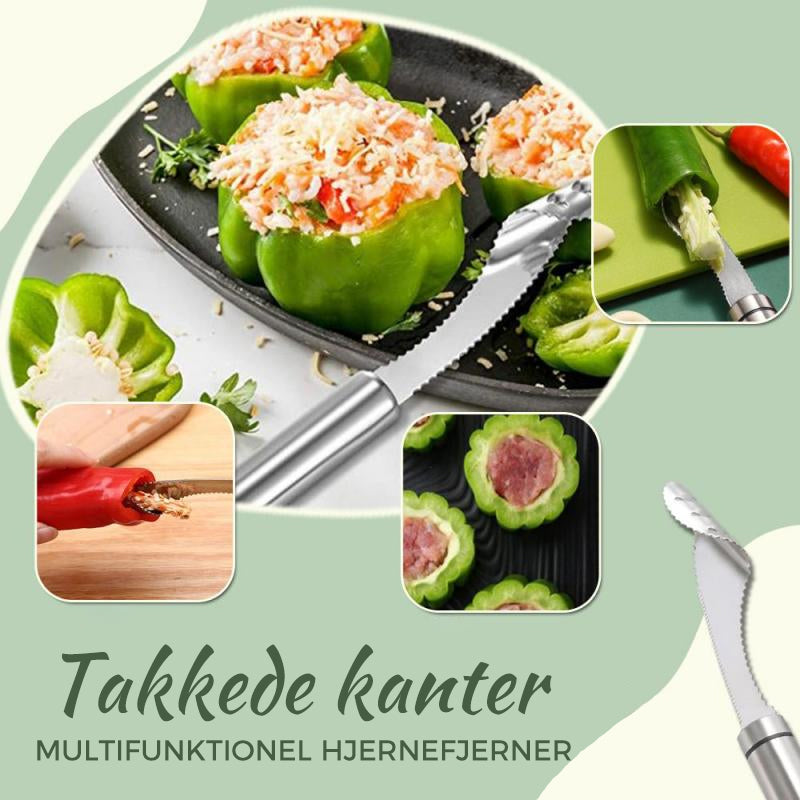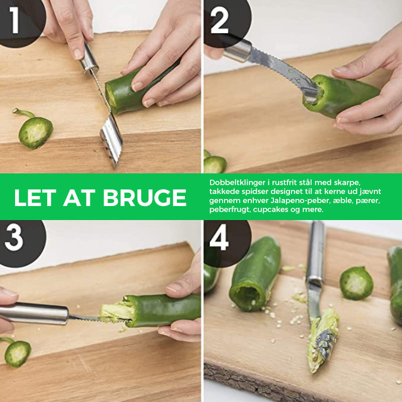 - Sikker: Peberkernerfjerner lavet af fødevaregodkendt rustfrit stål på bladet og håndtaget.