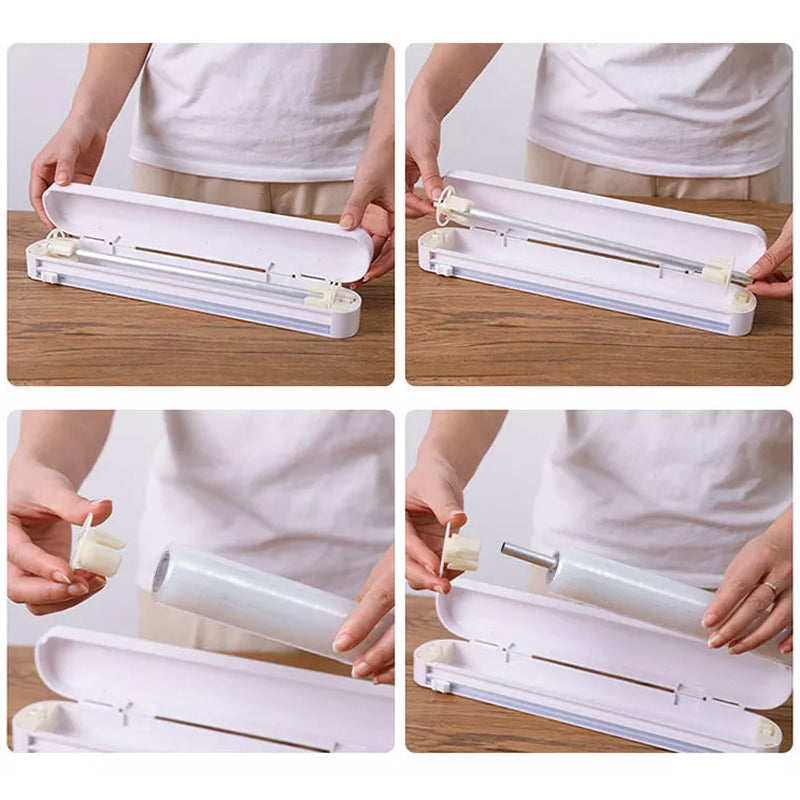 - HØJ KVALITET: Lavet af ABS materiale, høj- og lav temperaturs modstand, holdbar, ikke-giftig og ingen lugt. Tovejs glideskæreknap, træk den ønskede mængde husholdningsfilm ud uden at bruge det farlige båndsavblad eller saks. Den lille skærer snitter filmen perfekt. Ingen folder eller tilklistret plastik over fadet.