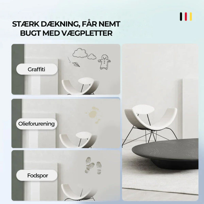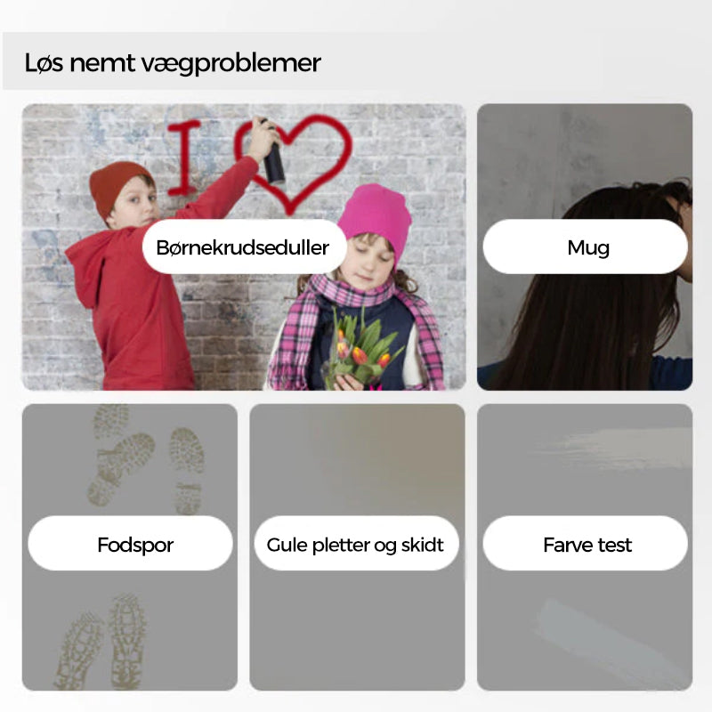 Fremragende dækning: Det efterlader ingen spor på væggen, små reklamer, pletter og børnekrudseduller kan fjernes med en enkelt børste, hvilket efterlader væggen ren og ryddelig.