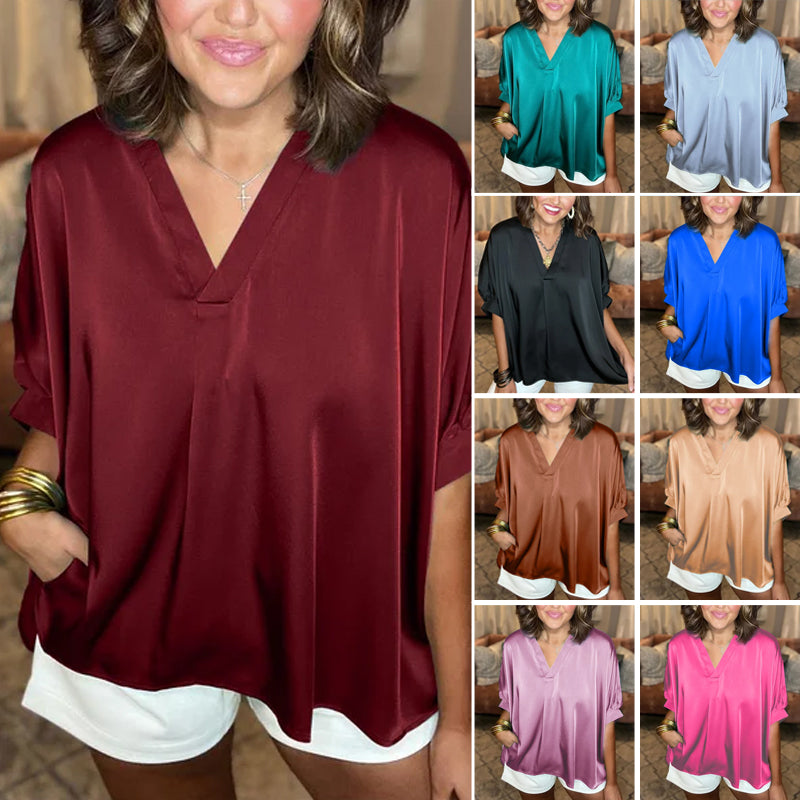 • Indlæs billede til gallerivisning Kortærmet top med V-hals i silke