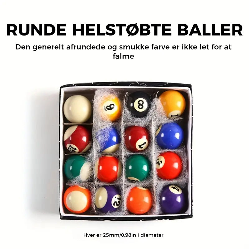 Tilbehør: et sæt billardkugler, stativ, poolkø, chokoladepulver, billardbordsstel