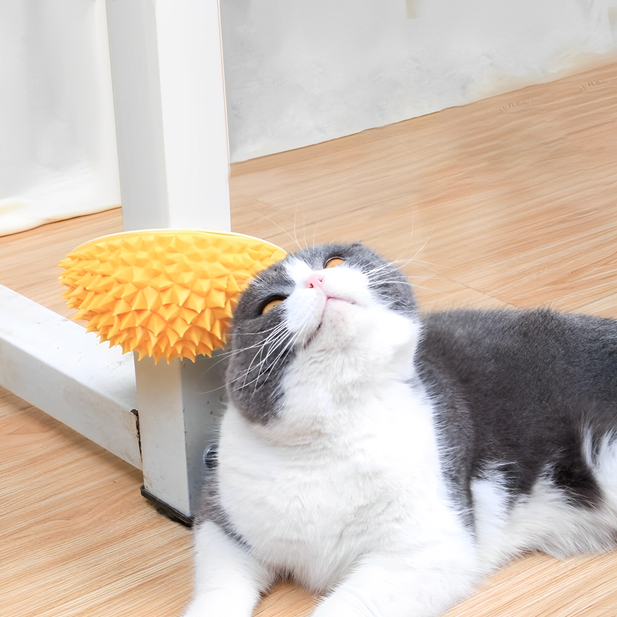 - IDEEL TIL ALLE STEDER: Det unikke design er velegnet til to indsætningsmetoder: retvinklet opsætning eller påklæbning på en flad overflade, hvilket gør, at kattebørsten nemt kan etableres på væghjørner, sofaben, skrivebordsben og evt. forskellige, plane overflader eller hjørner, som din kat kan nå.