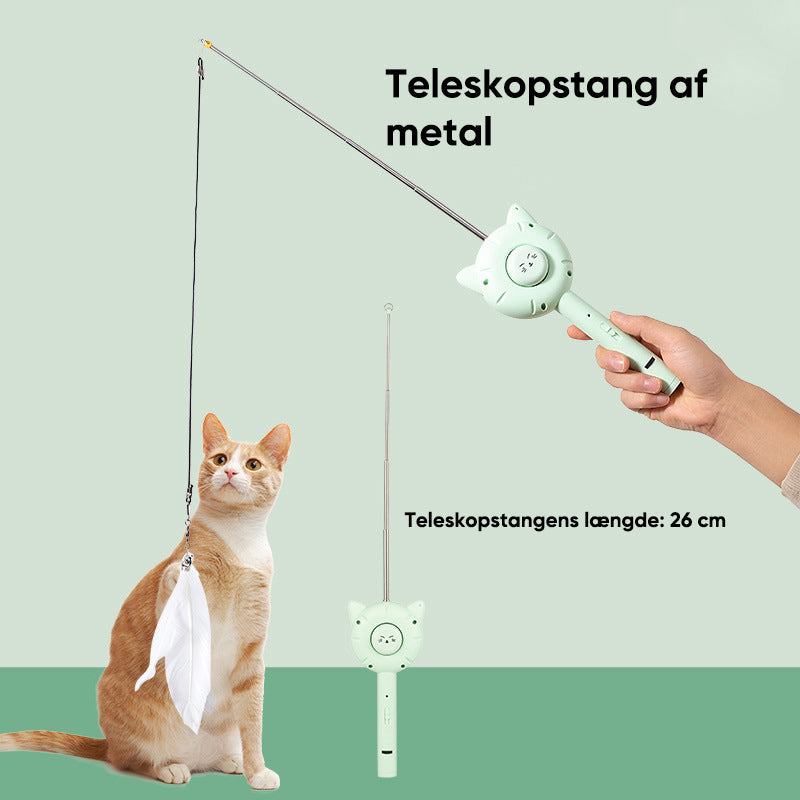 Fjerdrilleri: De realistiske og naturlige fjer, der er fastgjort til katteplejebørstens forlængelige stang, giver din kat en sjov og interaktiv oplevelse. Børstningen kæledyrshår sikrer, at din kats hud og pels forbliver sund, mens fjerdrilleri og legetøjsmuligheder giver masser af underholdning.