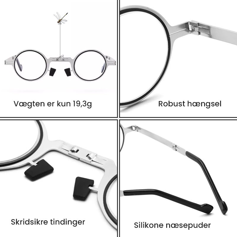 - Skrueløst design, nem sammenfoldning (leveres med et lille bærbart brilleetui)