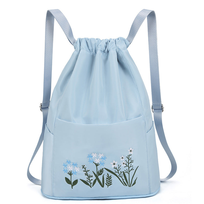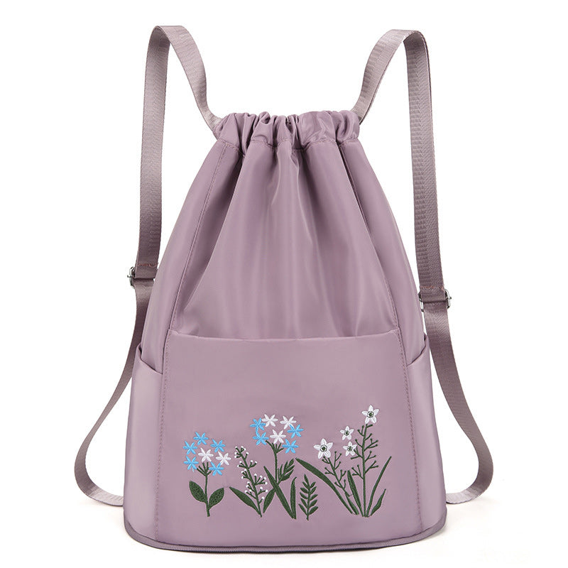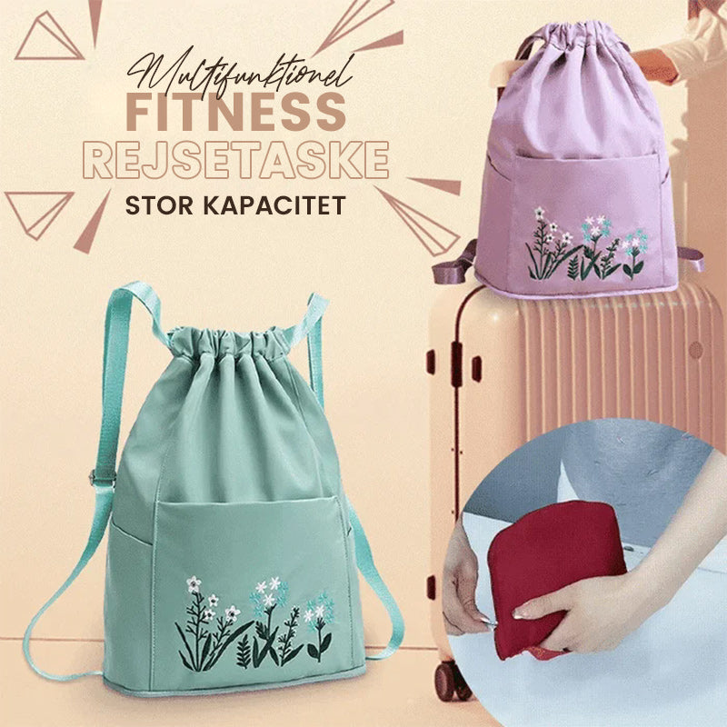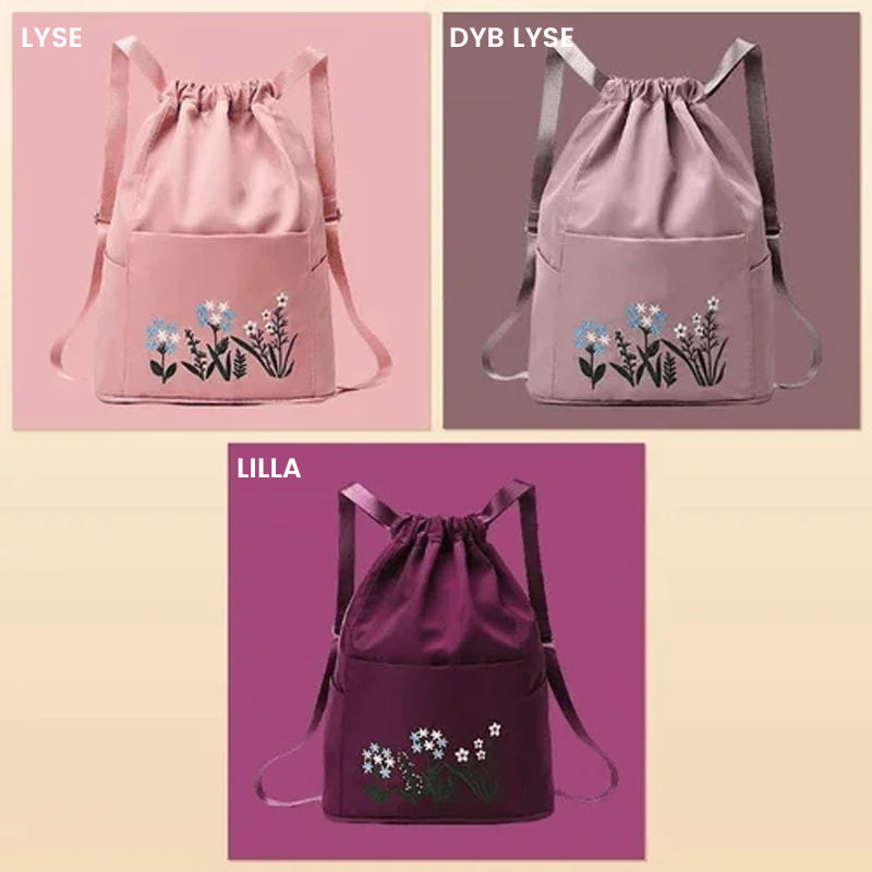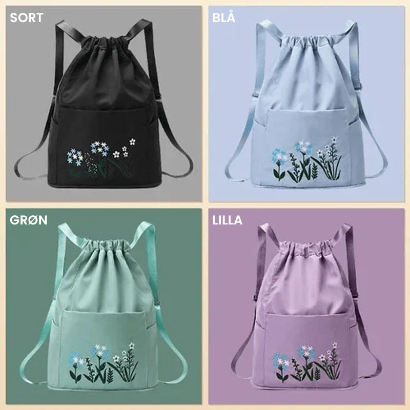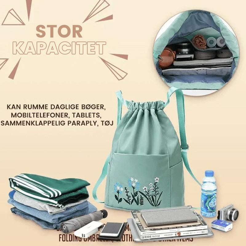 En hovedlomme, en sidelomme og en forlomme kan rumme ting. Strukturen med flere lag adskiller også det våde fra det tørre. Snoretrækket gør den nem at åbne og lukke.