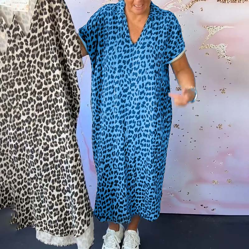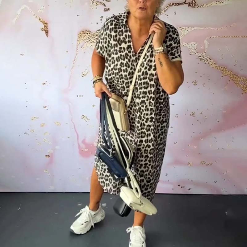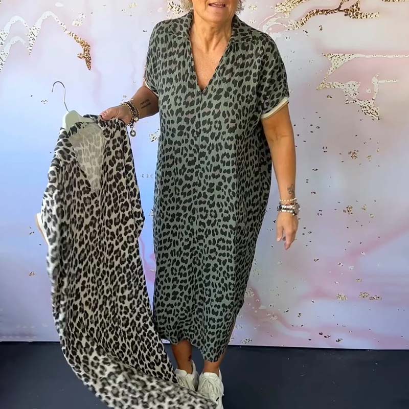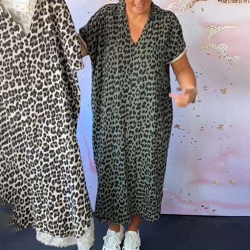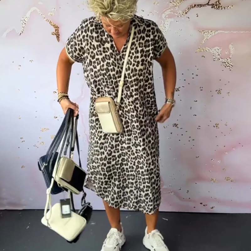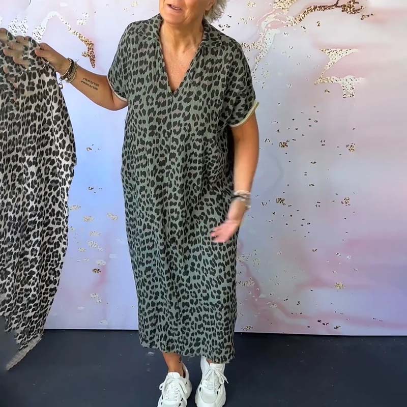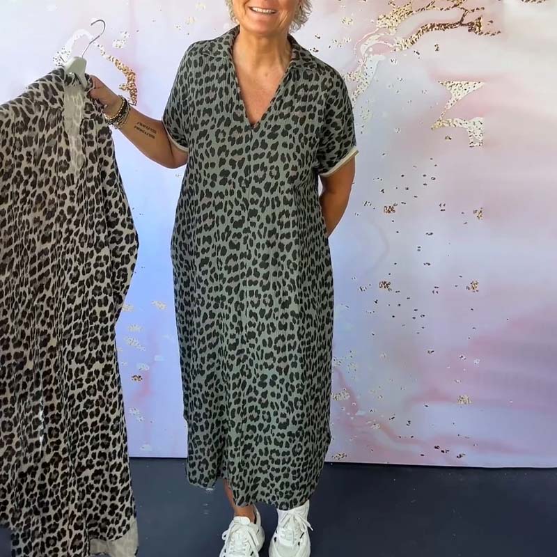 - 1*Kortærmet leopardprintet kjole med V-hals