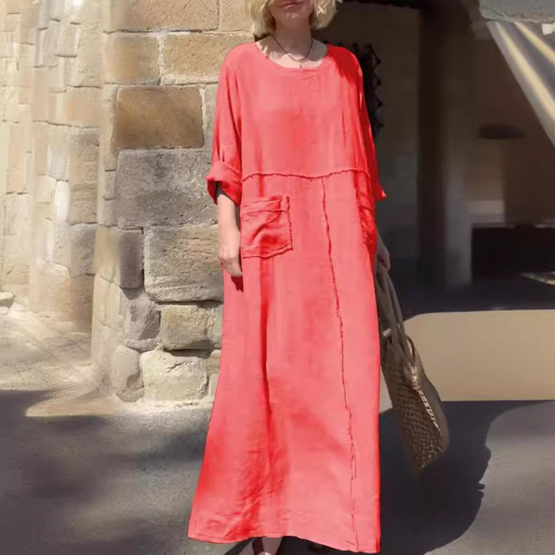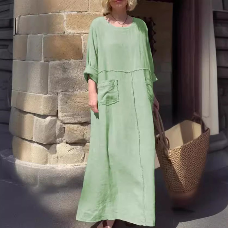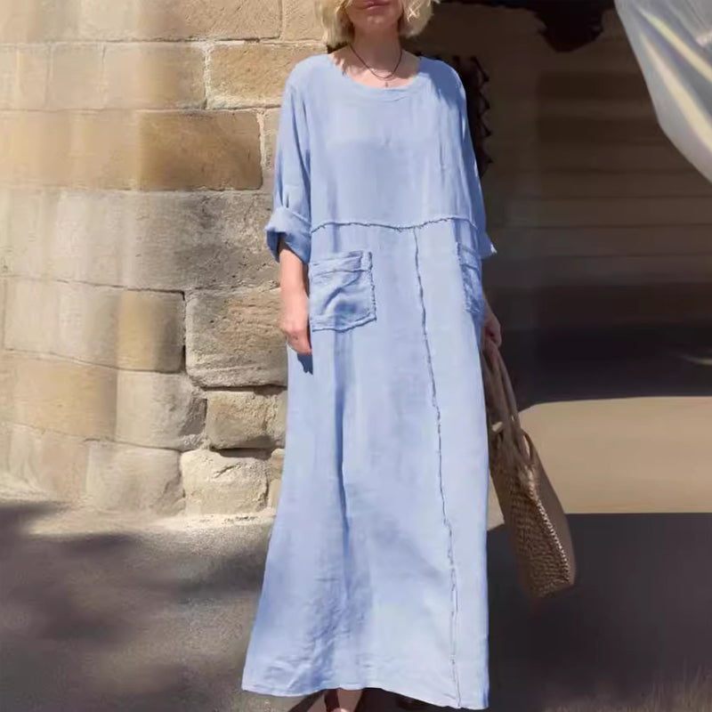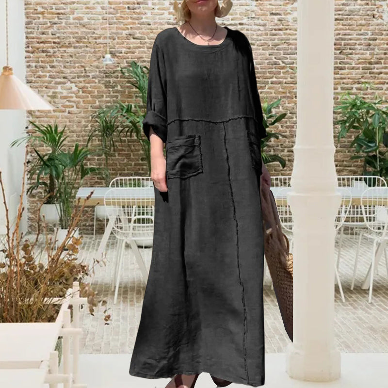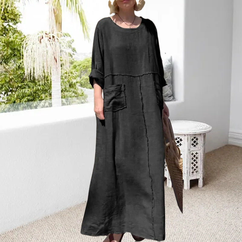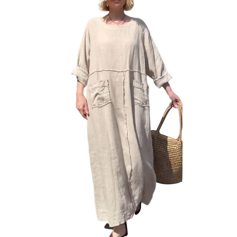 - 1*Langærmet fritidskjole i bomuld og hør med rund halsudskæring