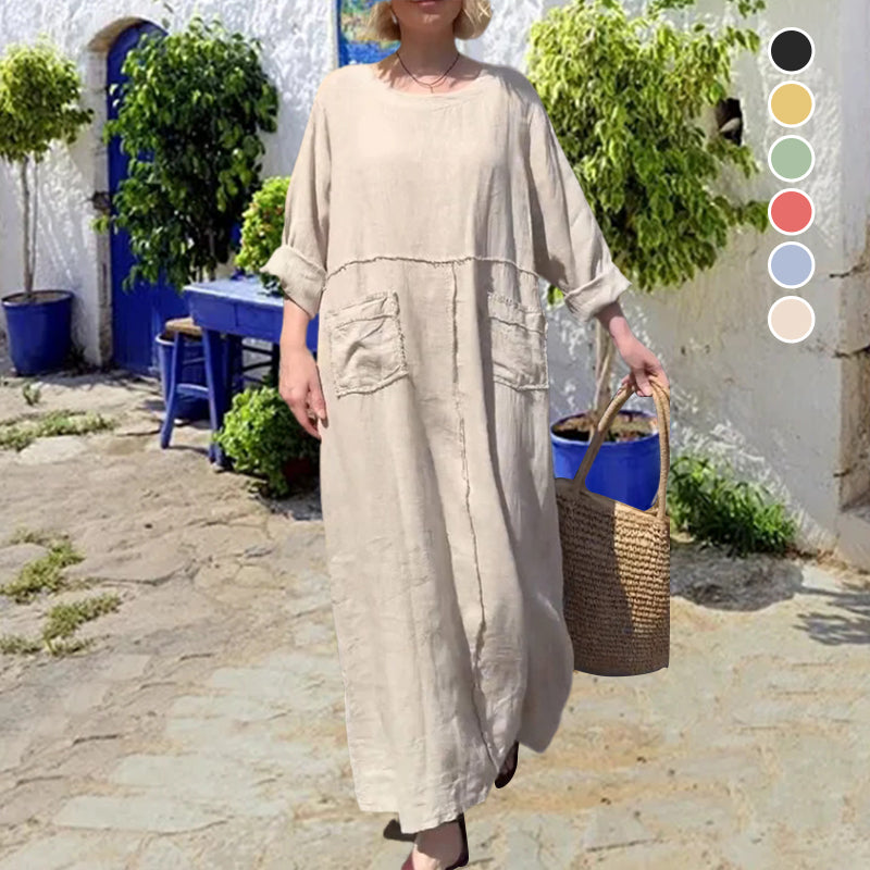 Udvid din garderobe med vores afslappede langærmede kjole. Denne kjole er lavet af bomuld og hør af høj kvalitet og udstråler tidløs elegance. Den er alsidig og sofistikeret og kan nemt tilpasses enhver lejlighed.