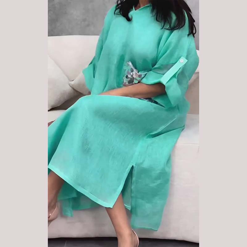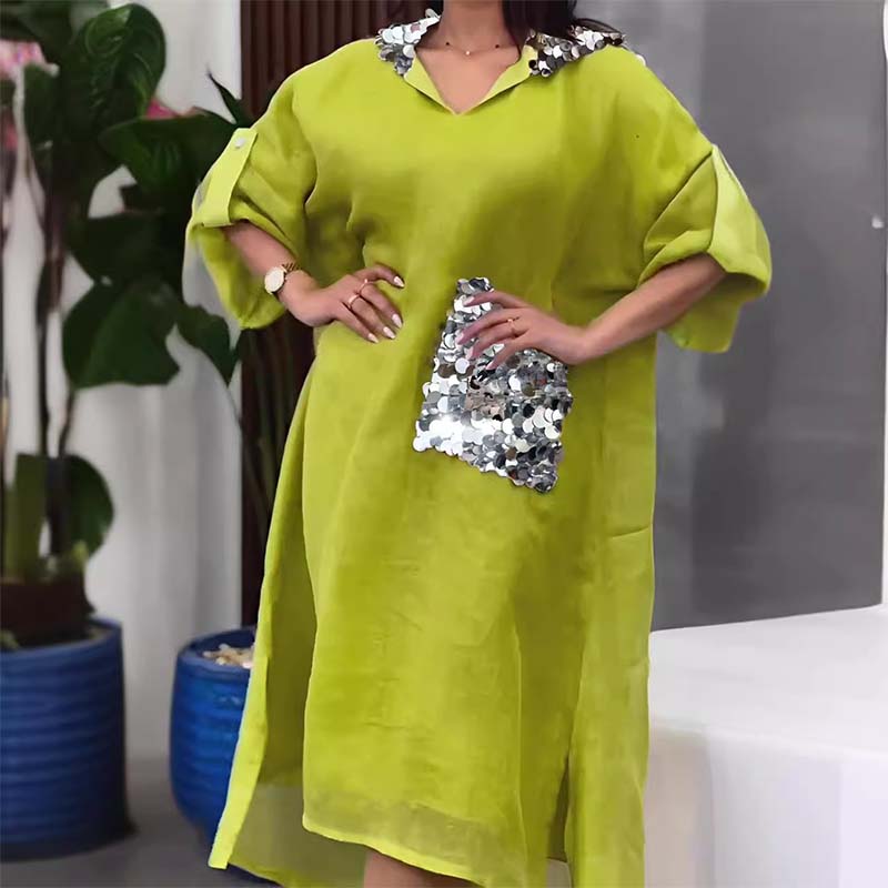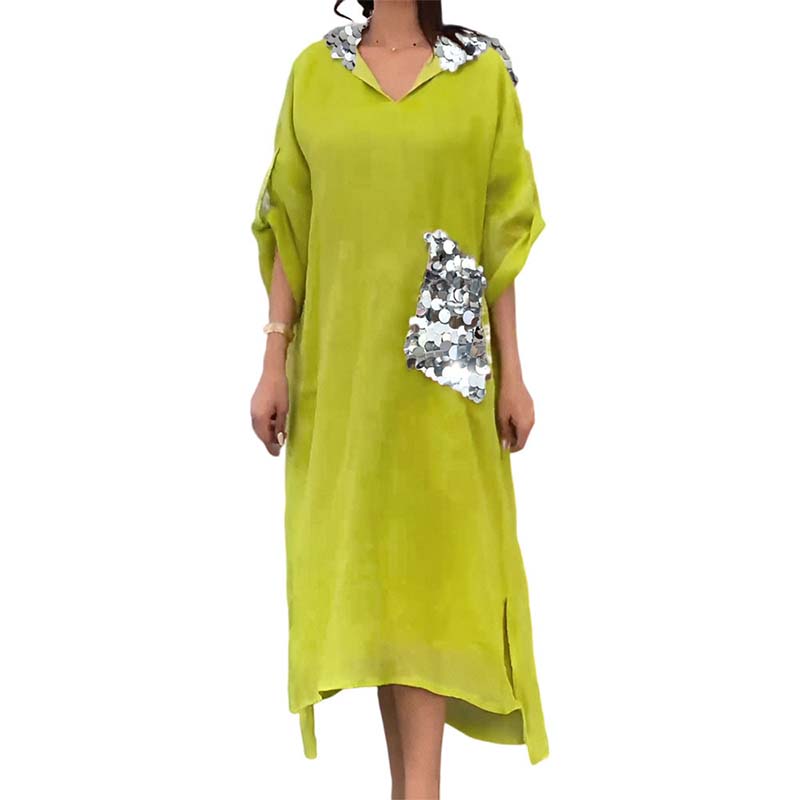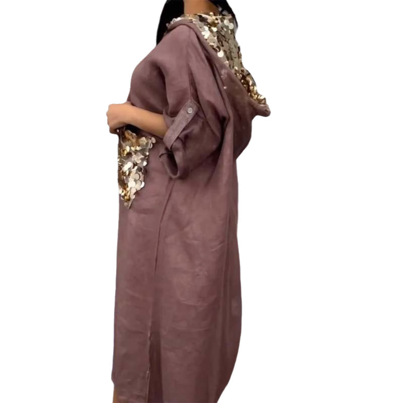 Maxikjole med hætte og pailletter i fiskeskæl
