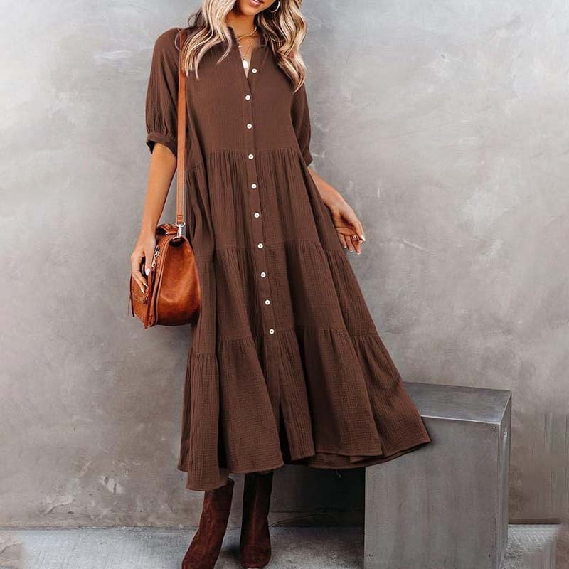 Denne afslappede kjole har et meget blødt og behageligt bomuldsstof, den har en krave og halve ærmer med knaplukninger fra top til bund og lommer på begge sider.