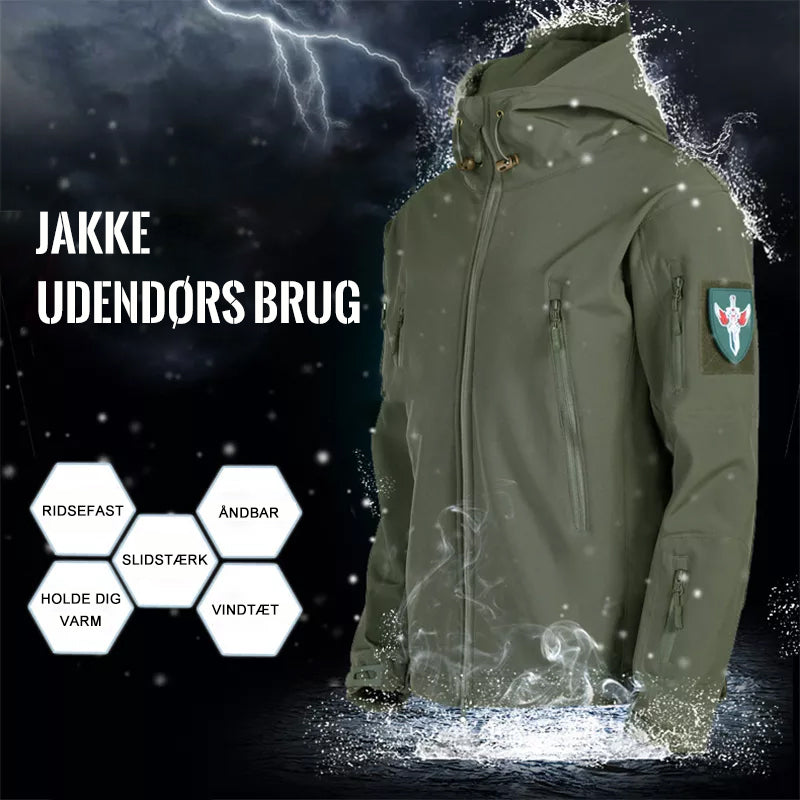 Design: Militært taktisk design med ståkrave, fuld lynlås og lap på hver arm.