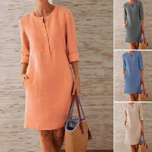 Renfarvet casual kjole med rund hals i bomuld og hør