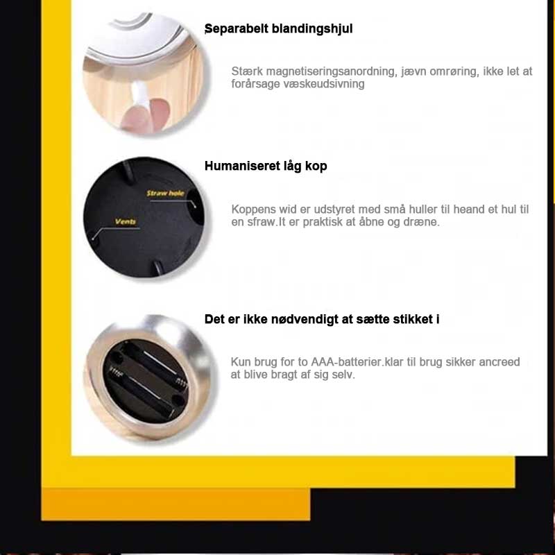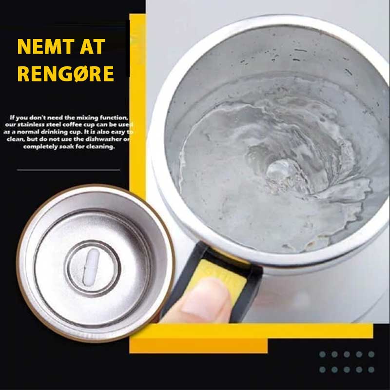 - Let at rengøre: Når du ikke har brug for omrøringsfunktionen, kan du bruge vores kaffekrus i rustfrit stål som en normal drikkekop. Det er også nemt at rengøre, men du må ikke sætte det i opvaskemaskinen eller sætte det helt i blød for at rengøre det.