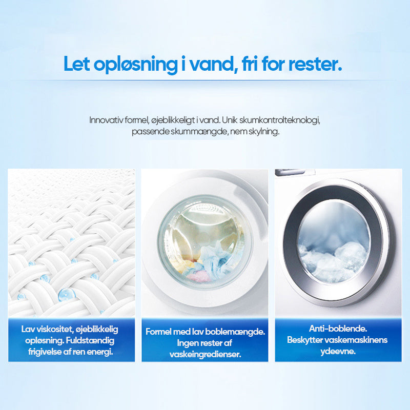 - Innovativ aktiv formel - Øjeblikkelig, unik skumkontrolteknologi mens tøjet lægger i vand, så mængden af skum under vask er passende og har nemmere ved at skylle. Lavviskositet, øjeblikkelig og omfattende frigivelse af ren energi, lav bobleformel, ingen rester af vaskeingredienser, ikke-boblende, for at beskytte vaskemaskinens ydeevne.