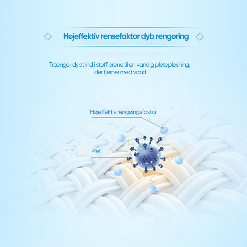 - Højeffektiv rengøringsfaktor - Trænger dybt ind i pletten for en vandig opløsning og fjerner med vand. Pletfjerneren indeholder også en pletfjerningsbooster for at forhindre pletter i at komme igen og fjerne dem helt.