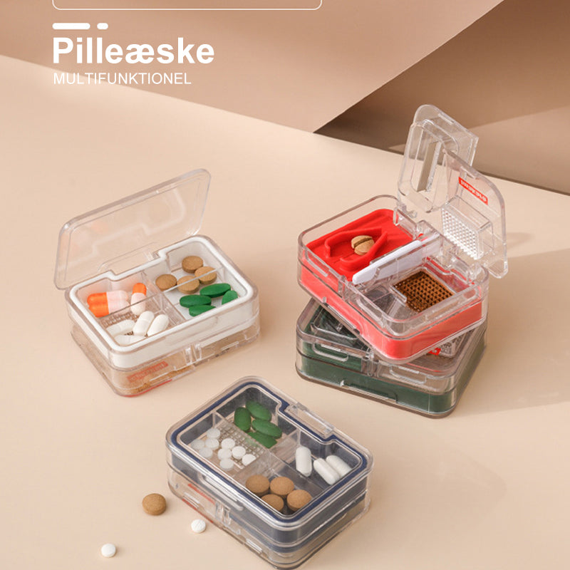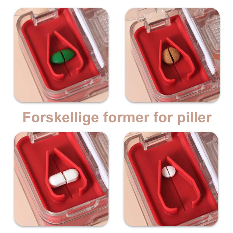 - 💊 Den skarpe klinge skærer medicinen rent uden rester.Indbygget skjult børste til nem rengøring og opsamling.Udstyret med et slibeområde, flere gange for at presse tabletten til pulver.