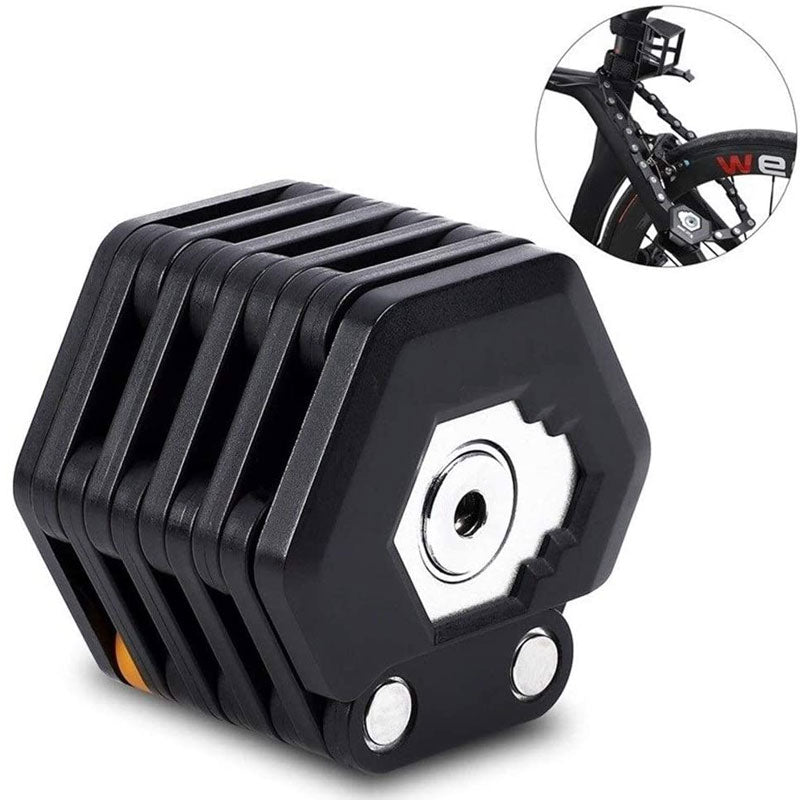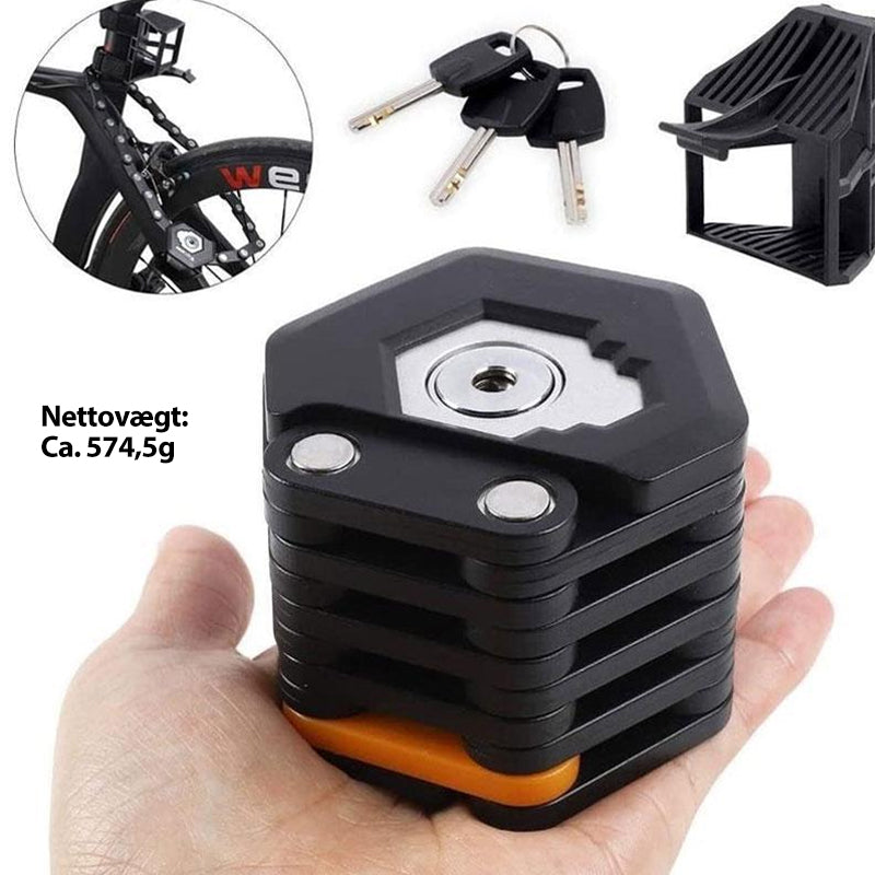 Lille og delikat ---Dette er en 26-leds foldecykellås med 3 nøgler. Den er mindre end din smartphone, lige til at have i lommen. Den understøtter mange forskellige cykler, heriblandt mountainbikes. Den kan låse et par cykler på samme tid. Når du træner udendørs med dine venner, medbringer du blot én foldelås til at låse din egen og din vens cykel sammen.