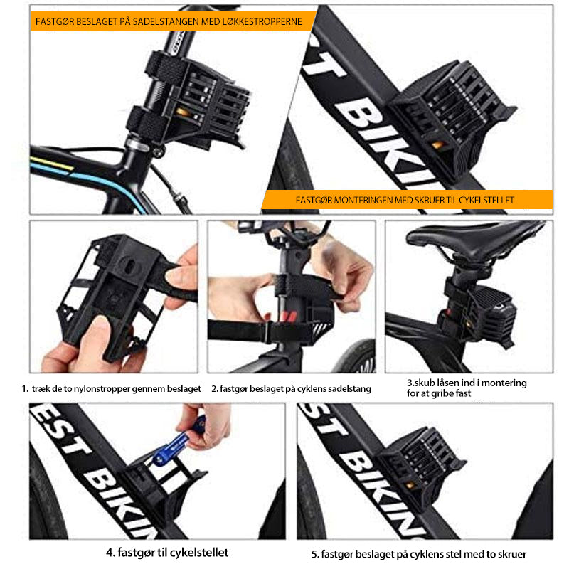 Sikker og enkel installation --- Denne lås kan sættes direkte på sadelpinden med en basemontering. Den justerbare diameter passer til enhver størrelse sadelpinde og er nem at bruge. Det bærbare design sørger for, at foldelåsen er kompakt og kan sættes godt fast.