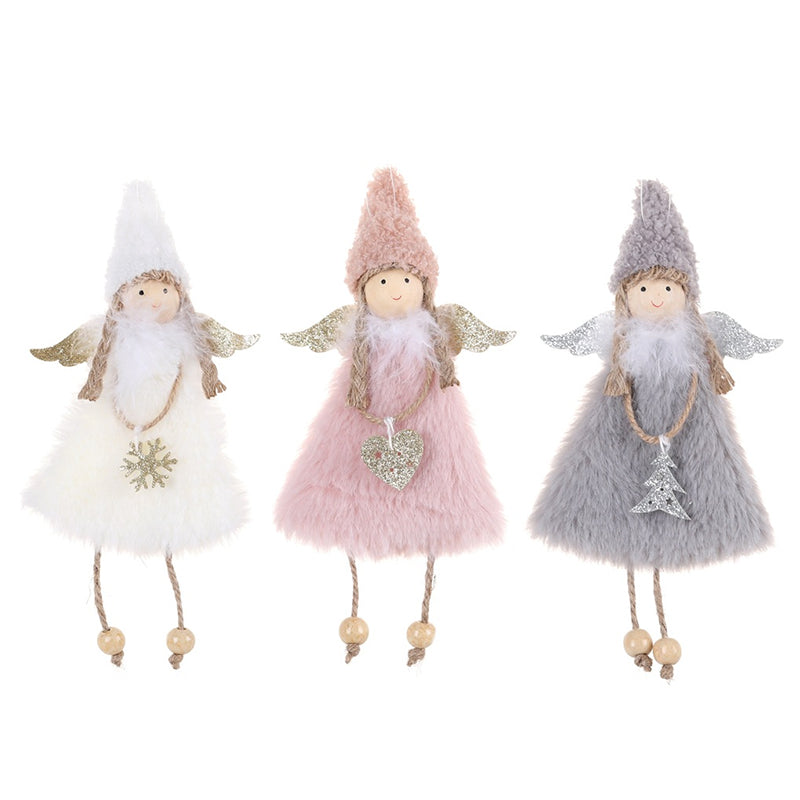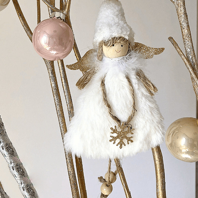 Hver engel er fremstillet med kærlighed af højkvalitets plys, træ, jute og fjer for at sikre fremragende kvalitet. Klædt helt i blødt plys og hånddekorerede med smukke vedhæng og vinger, vil disse søde engle tilføje et unikt touch til din juledekoration eller gaver. De naturlige materialer gør det muligt for vores ornamenter at være lette og delikate, når de dingler fra garnet. Hver engel er unik på sin egen måde!