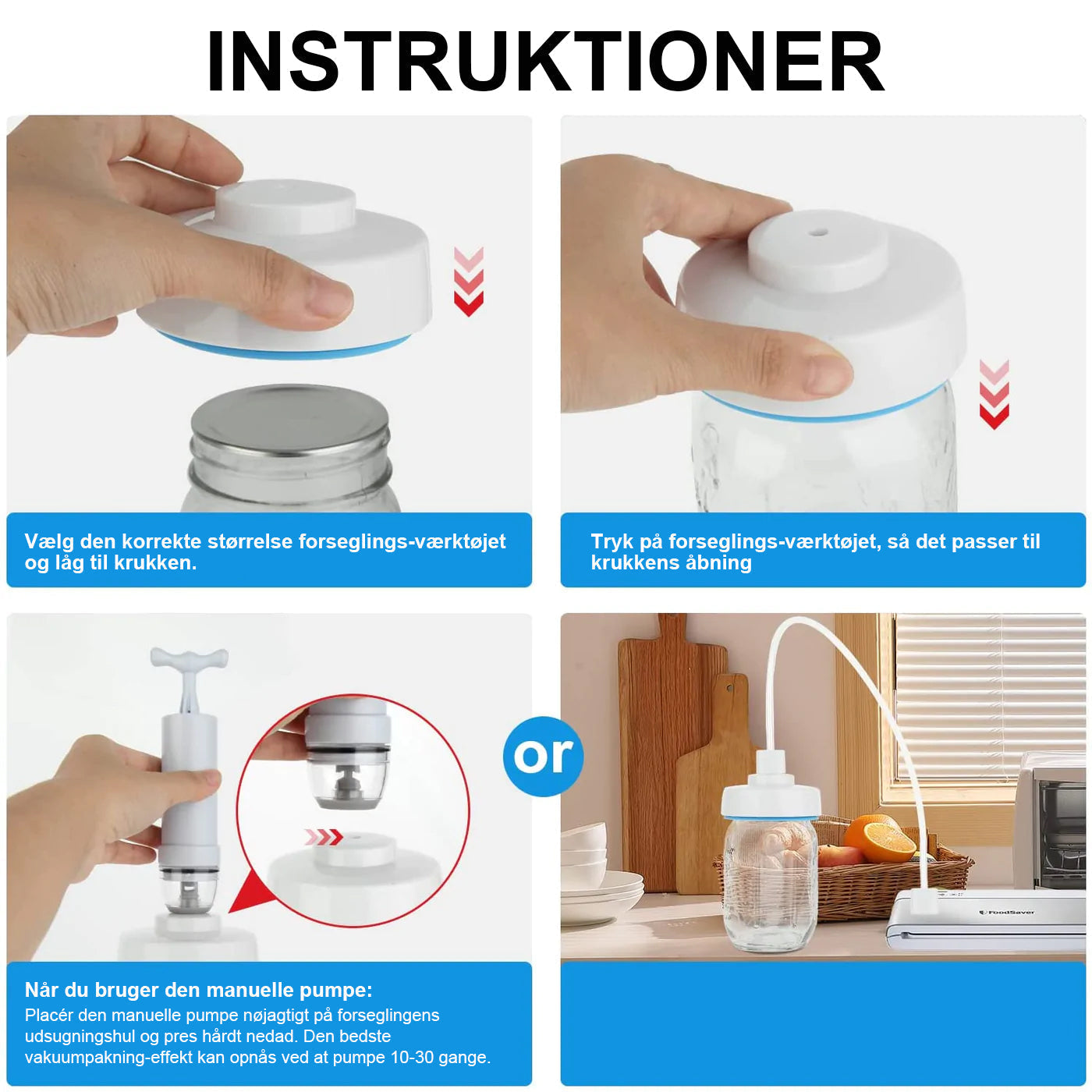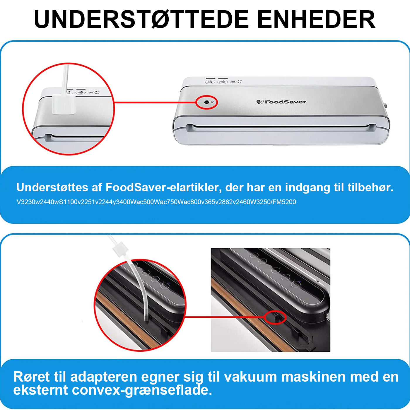 - Kompatibel med FoodSaver vakuumforseglingsmaskine. Automatisk og manuel dobbeltbrug. Hvis du ikke har en FoodSaver vakuumforsegler, giver vi dig en håndpumpe.