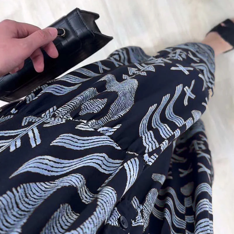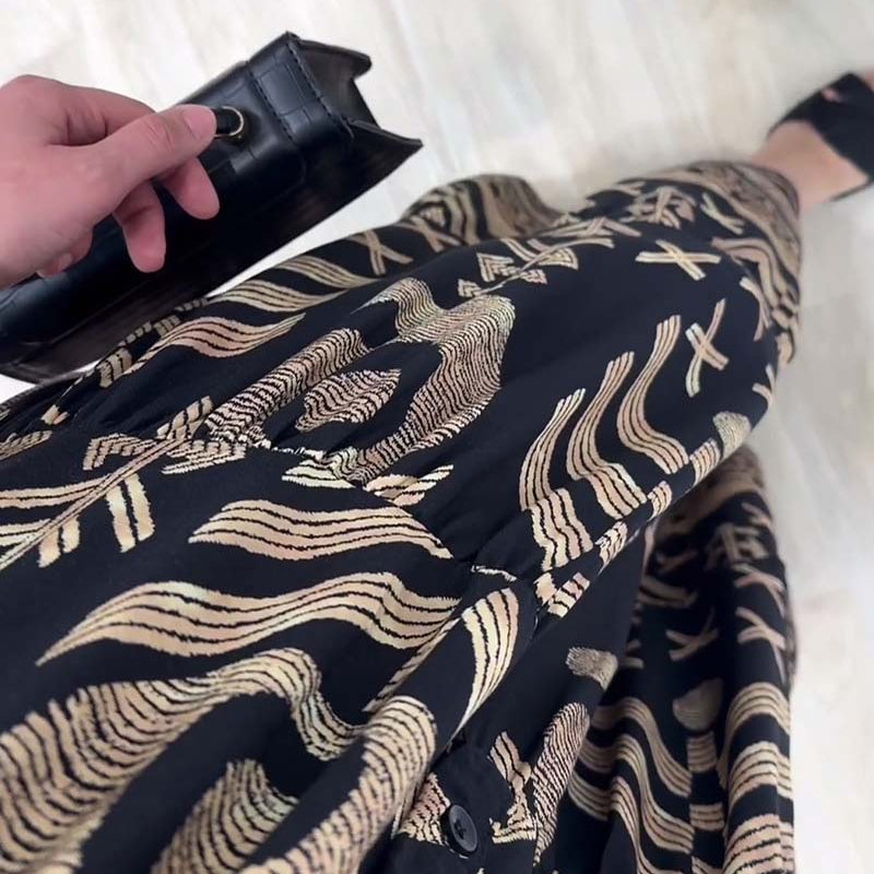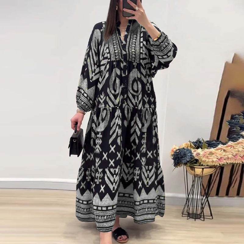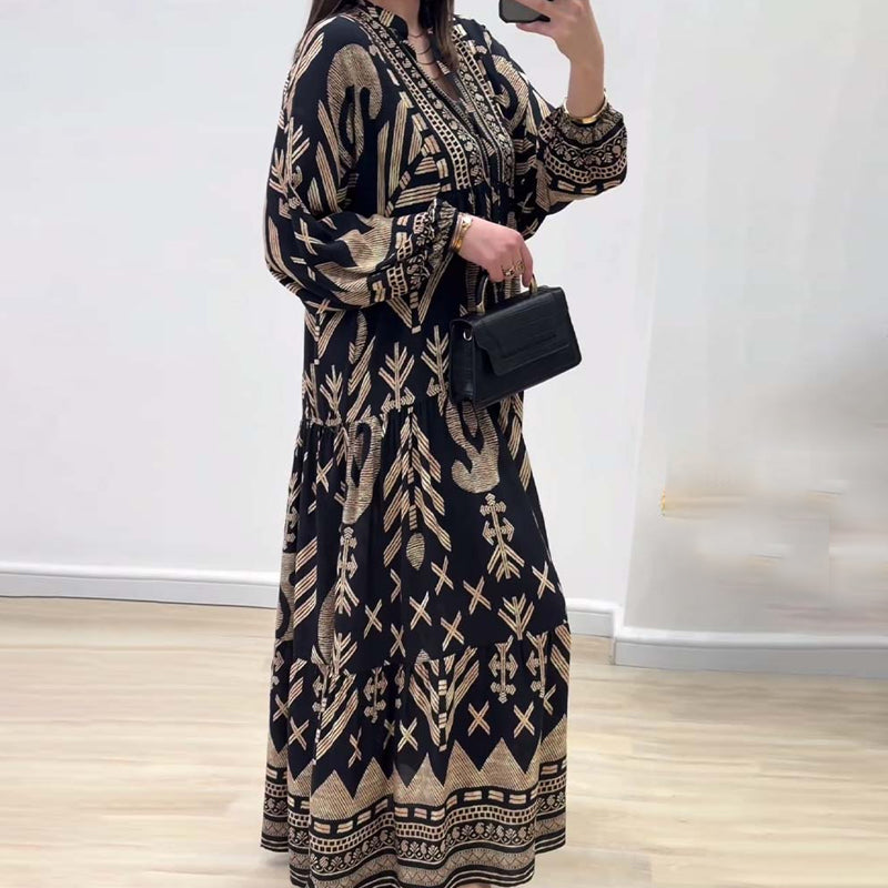• Indlæs billede til gallerivisning Langærmet kjole med V-udskæring og print