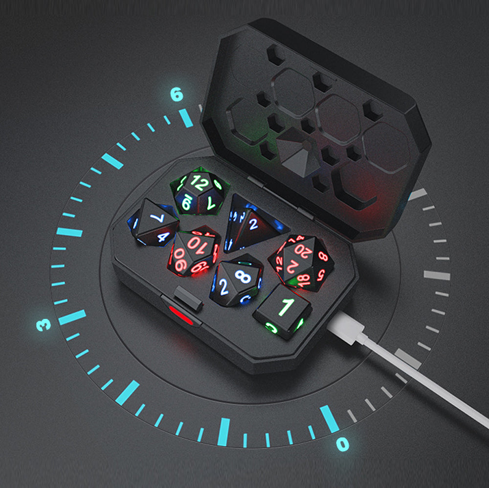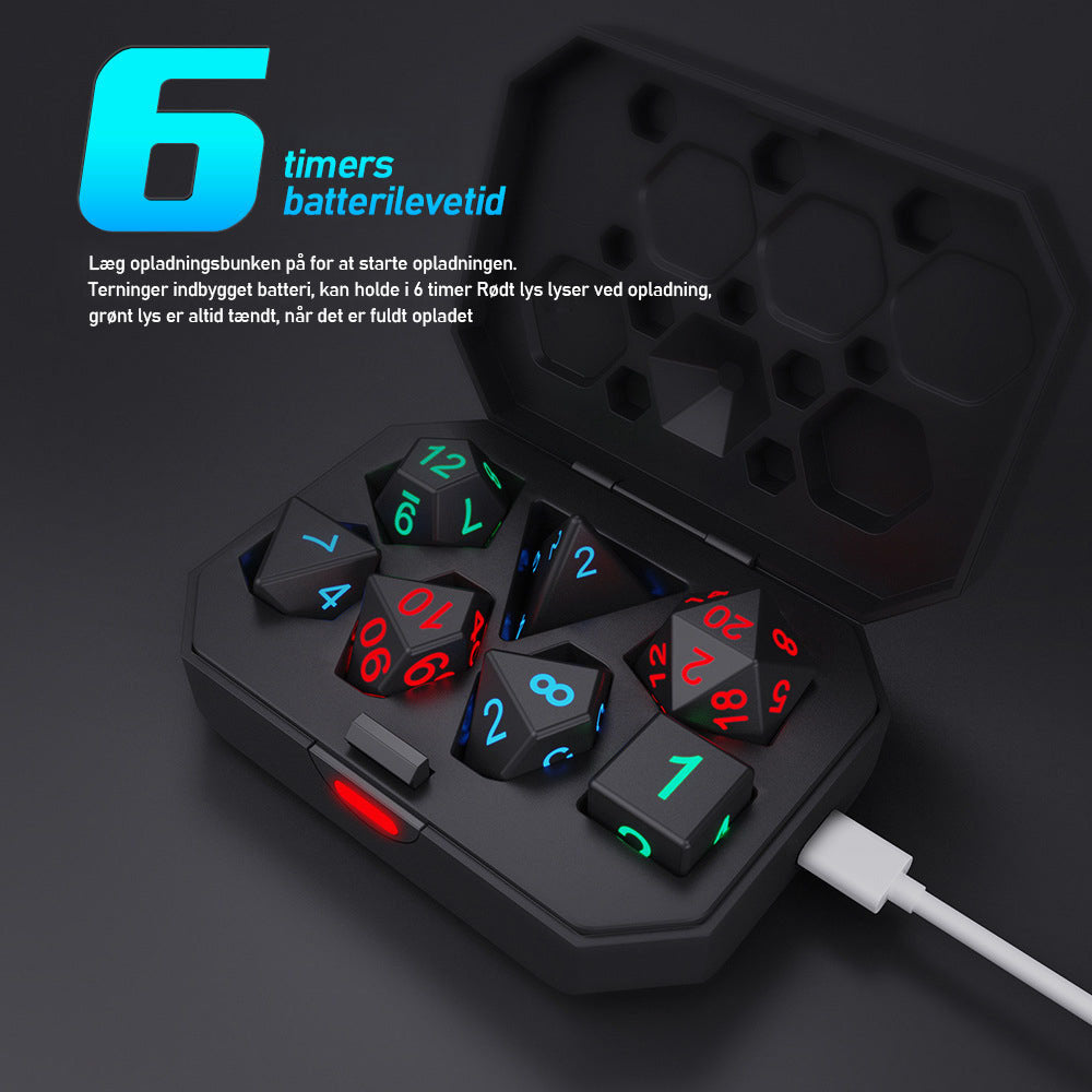 - Afgiftspligtige: Opladningstid er 2 timer. Den lysemitterende terning kan bruges uafbrudt i ca. 6 timer efter fuld opladning. Efter en fuld opladning tændes det grønne lys. Terningerne kan blive ved med at lyse i 10 sekunder ad gangen. Du kan oplade de elektriske terninger via strømadapter/ powerbank/ PC, terningerne snubber aldrig ud. Opladningskabel er inkluderet. USB-interface er type C interface.