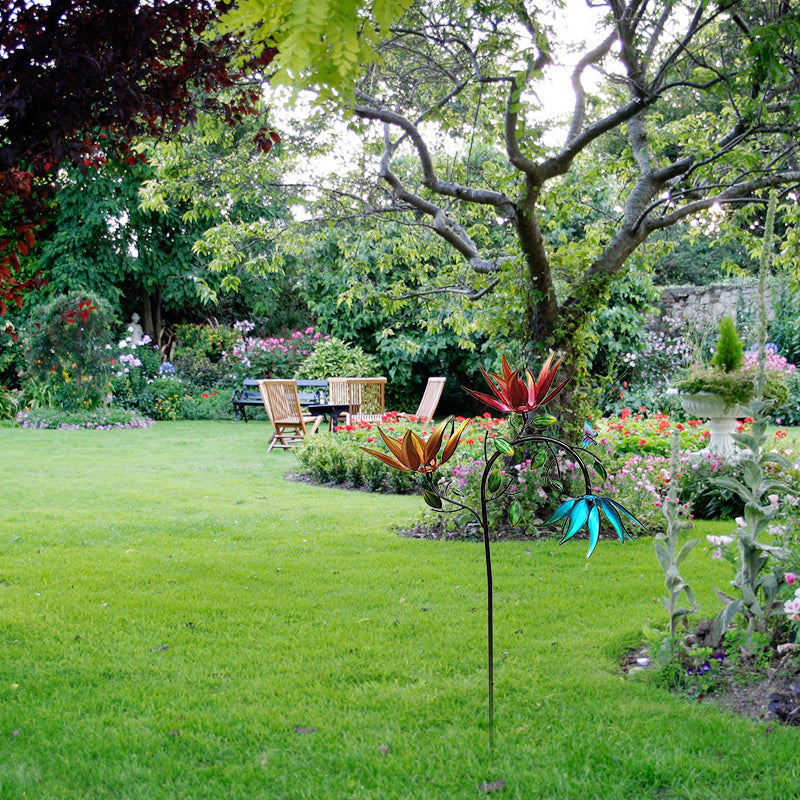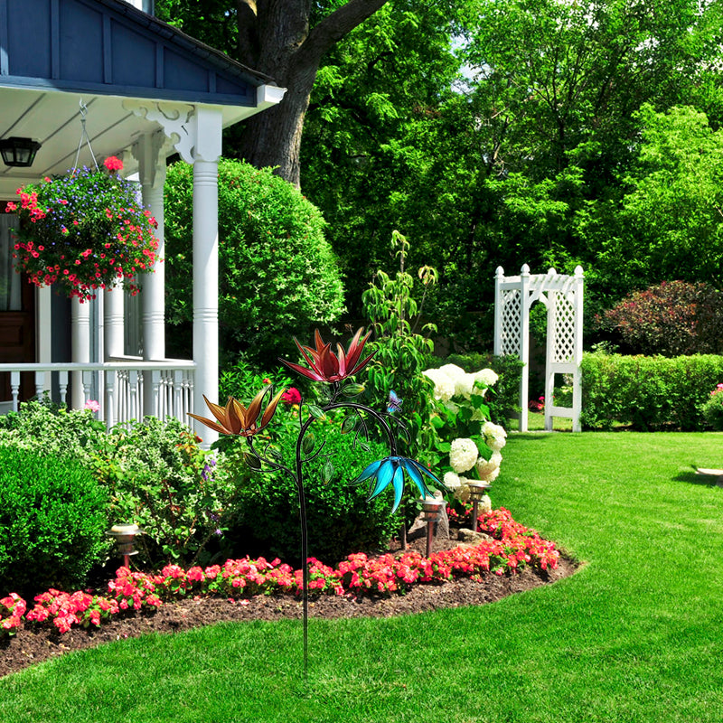Du vil nyde en smuk udendørs kinetisk vindspinner med en tre-lags blomsterkaskade af gule, lyserøde og blå blomster og sommerfugleaccenter.